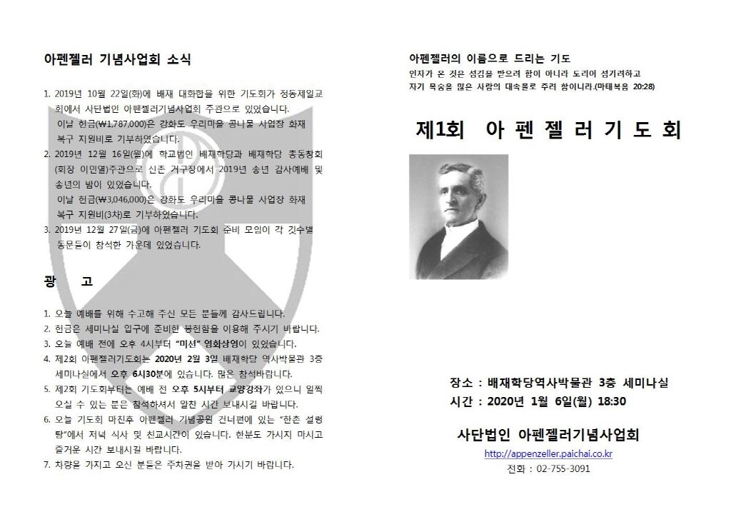 제2회 아펜젤러 기도회는 2020년 2월 3일 오후 6시30분에 있습니다.